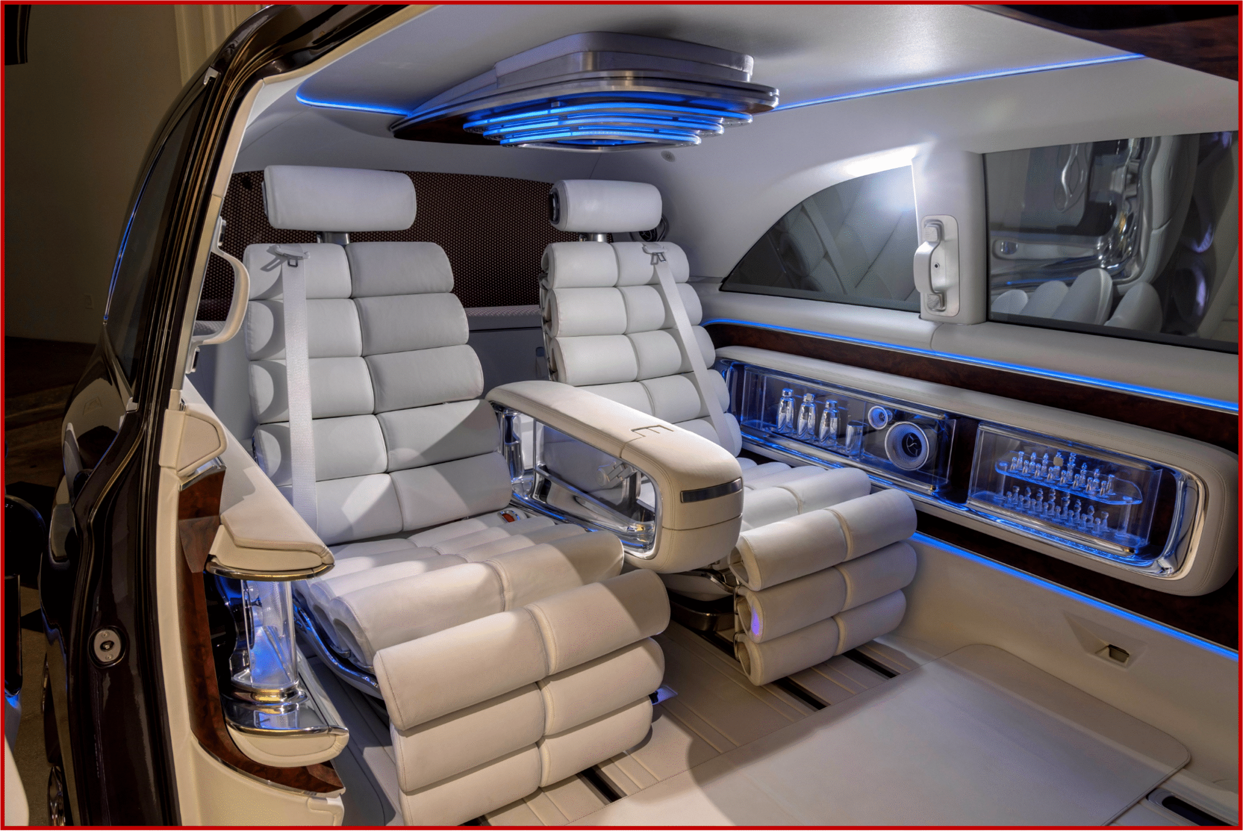 Both new technical aspects are integrated in the Vision V’s “Private Lounge” with its retractable, 65-inch cinema screen located under the floor. As soon as the passengers are inside and the doors are closed, it glides from a console designed with burr wood and Nappa leather. Through the transparent slats in the floor, passengers can watch as the display extends and separates the “Private Lounge” area from the cockpit.