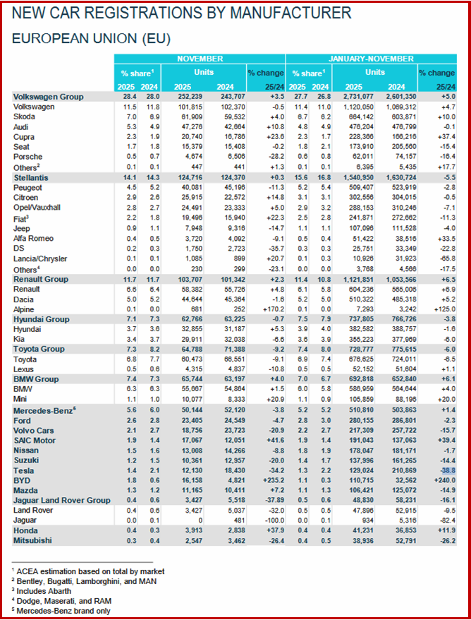 During November 2025 year-to-date (YTD), new EU car registrations increased by a mere 1.4% compared to the same period last year, according to data published today by the European Automobile Manufacturers’ Association. [aka ACEA at AutoInformed after its original French name].*Tesla during November dropped -34.2% at 12,130 units continuing its flat spin downward. YTD at 129,024 Tesla at is off -38.8%.