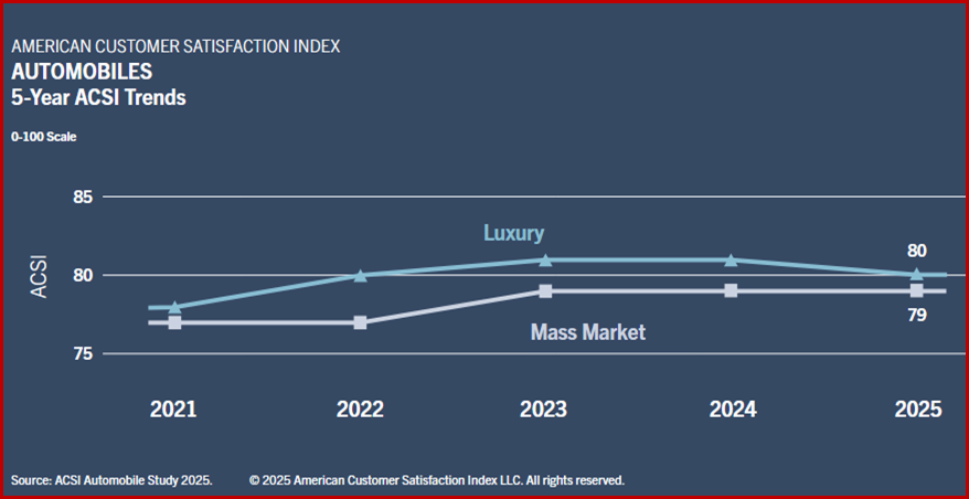 The U.S. automobile market is selling the highest number of vehicles sold in five years. However, given the ongoing Trump Tariff chaos, prices will be rising and lower-priced models are now an endangered species. Thus, affordability has reemerged as a crucial issue. There are risks with drivers operating under various scenarios that mean longer periods of larger payments or hanging onto older vehicles well past their warranties. According to the latest American Customer Satisfaction Index (ACSI®) Automobile Study 2025,* overall driver satisfaction slipped 1% to a score of 79 (on a 100-point scale). The luxury segment dropped 1% to 80 ,while the mass-market segment is unchanged at 79. Smaller brands (both mass market and luxury) that comprise the “all others” measure slide 9% to 74.**