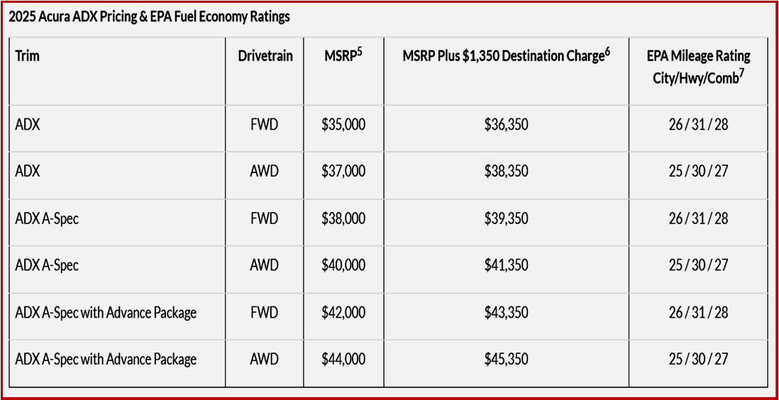 The 2025 ADX, an all-new premium compact SUV, begins arriving at Acura dealerships today. It’s billed as a new access model that will heighten the appeal of Acura as a destination brand for a new generation of buyers looking for youthful styling, top-class features and an engaging driving experience, all at an allegeable attainable price point. The bet on pricing is that a $36,000 to $45,000 SUV – plus options – will attract younger buyers, who are in a perilous position given a U.S. economy facing another Trump Administration trade-war and tariff -induced recession.