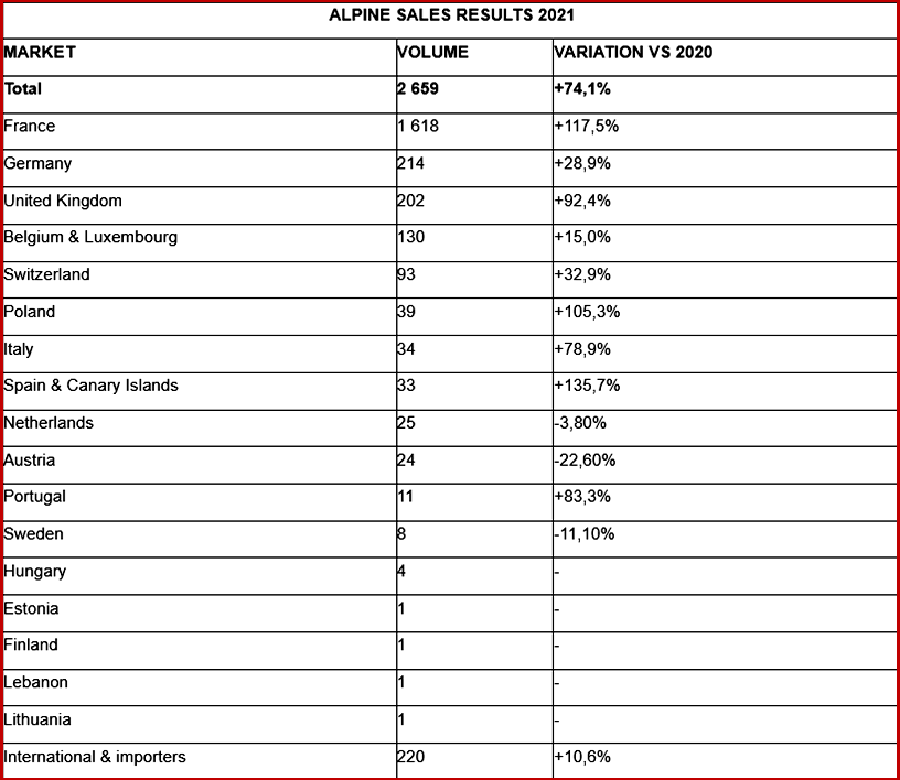 Alpine says its objective for international expansion with sales beyond the French border sees targeting key foreign markets. During 2021 sales increased in the UK of more than 92%; 24% on the DACH market – Germany, Austria and Switzerland; as well as 79% in Italy and 120% on the Iberian market of Spain and Portugal. With a network of 100 dealerships (including 25 new point of sales in 2021), spread mostly across France and Europe, Alpine will continue to expand its geographical footprint by setting up 50 additional dealerships in 2022 in Europe and in the rest of the world.