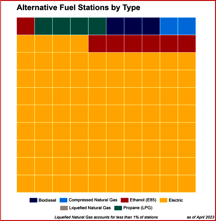 EV charging stations – like wealth and taxes – are not evenly distributed in the US. Of the more than 60,000 EV charging stations, California is home to ~16,000 or about 21%. New York, Florida, Texas, and Massachusetts close out the top five states with the greatest number of EV stations, with at most 2500 stations each. Normalizing the data per 1000 road lane miles, Washington, DC had the highest number of stations, at 102 per 1000 lane miles, followed by Hawaii then California. Arkansas was the leader in terms of its rate of charging station growth in 2022 to 2023, followed by North Dakota, Michigan, Louisiana, and New Jersey. All five states increased the number of their electric vehicle charging stations by more than 25%.