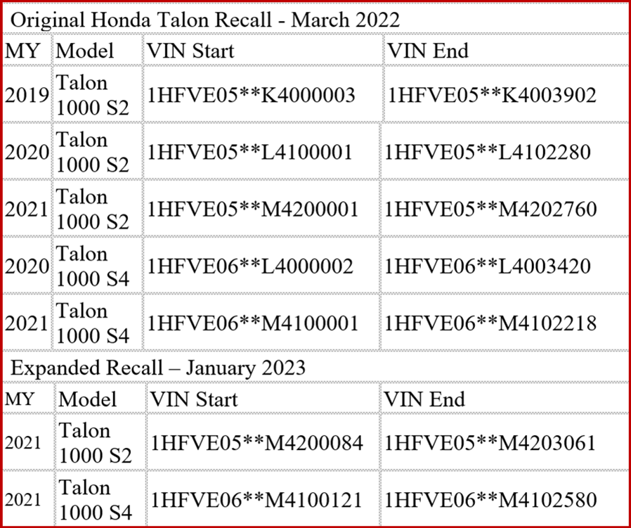The Talon ROVs were sold in various colors including red, blue, green, gray and yellow at authorized Honda Powersports dealers nationwide from March 2019 through September 2022 for between $20,000 and $27,000. “HONDA” is printed on the front, sides and the rear of each vehicle. “Talon” is printed on a label located on both sides of the vehicle. The Vehicle Identification Number (VIN) number is stamped on the frame on the left side under the left front fender. The VIN range for affected Talon 1000s is in the chart.