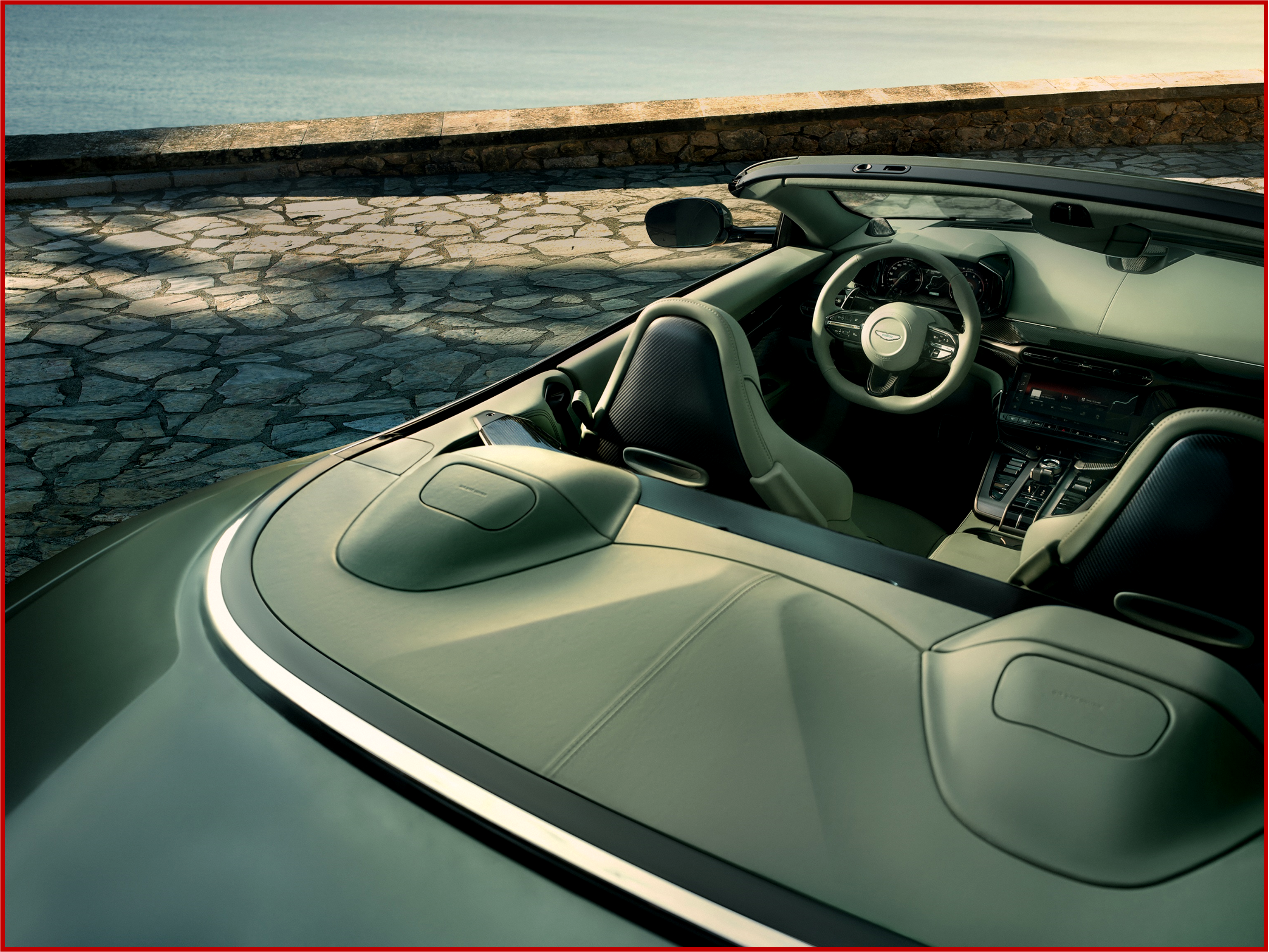 The lightweight K-fold roof can be opened in 14-seconds and closed in 16-seconds, and is operable on the move up to 31 mph (50 km/h) via a metal switch on the center console. Furthermore, the roof can be opened or closed remotely from the key fob, within a two-meter radius of the car. Perhaps more remarkable is the level of thermal insulation directly comparable to Vanquish Coupe. With a class-leading stack height of just 260 mm when retracted, the acoustically enhanced fabric roof can be stowed under the tonneau behind the seats without interruption to the seamless flowing lines of the body.