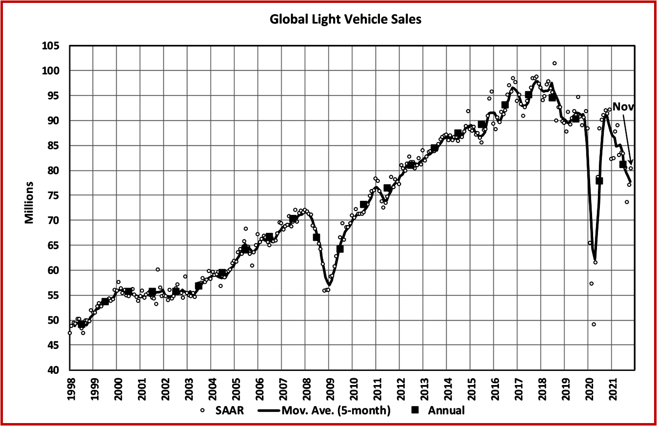 The latest Global Light Vehicle selling rate in November is stuck close to the 2020 pandemic year total of 78munits, according to LMC Automotive. In fact, it appears to AutoInformed that the US is trending back to the Republican Great Recession levels of 12 million units. Semiconductors are at the heart of the supply crisis, according to the conventional wisdom. However, the disruptions in supply chains are much deeper, with the pandemic returning in force with no end in sight.