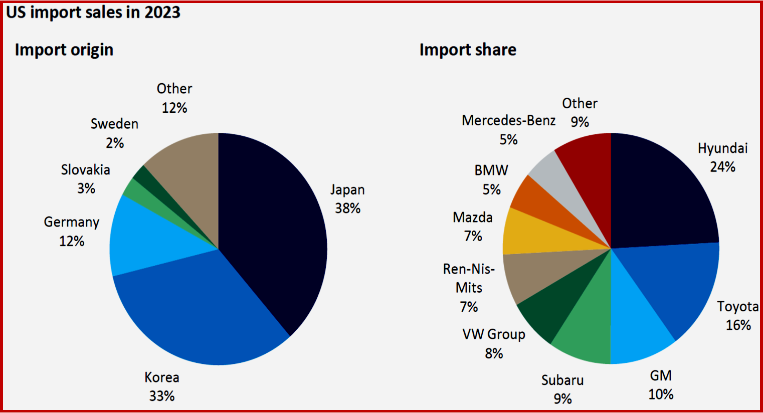 “Japan, Korea and Germany are the main origins for vehicles entering the US market, so brands with heavy production concentrations in those locations have the potential to be impacted more significantly, especially those in Europe,” said the GlobalData* consultancy. “It is no surprise that Hyundai and Toyota were the top importers, though General Motors (GM) was the third largest, with vehicles coming from Korea and China. VW Group is among the top 5 importers, while BMW, Mercedes-Benz, Volvo and Stellantis are also exposed to potential disruption.”