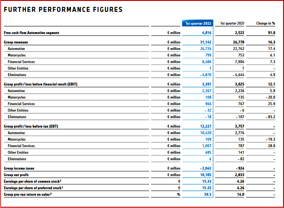The BMW Group during Q1 of 2022 posted today an earnings return before taxes margin of 39.3% compared to 2021 at 14.0% based on a Net Profit of €10.185 billion, up 256%. The financial results saw Q1 revenues up 16.3% to €31.1 billion (2021: € 26.778 billion). Earnings per share grew to €15.33 from €4.26 a year ago. This significant increase is a result of the full consolidation of Brilliance China Automotive Holdings Ltd., or BBA. Without the consolidation effects, margin was 18.4%. (AutoInformed: BMW Takes Majority Share in Chinese JV Brilliance Automotive)
