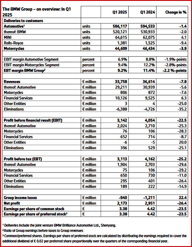 • Given the sustained demand for its attractive premium vehicles, the BMW Group is able to confirm its guidance for the year. The company anticipates slight sales growth, with fully-electric vehicles contributing to a slightly higher share of deliveries. Due to the factors mentioned above, Group earnings before tax are expected to be on a par with the previous year.**The EBIT margin for the Automotive Segment is forecast to be within the range of 5.0-7.0%, with an RoCE of between 9-13%.