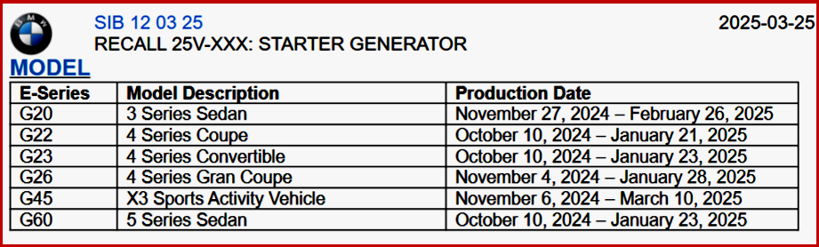 “This safety recall involves the power connector component of the starter- generator which may not have been produced by the supplier according to specifications. During the supplier production process, a gap could form at the connector location. If a gap exists, this could cause a loose connection between the connector and the positive battery cable (or wiring harness). As a result, resistive heating could start to occur,” BMW said in the required safety defect recall filing made public this morning by the National Highway Traffic Safety Administration.