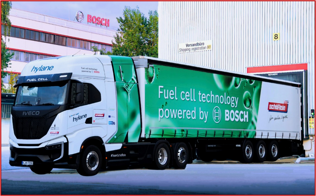 Bosch said today that it has taken another step toward climate-friendly logistics. Its Nuremberg plant recently started using a fuel-cell electric truck in plant traffic. The truck is equipped with the Bosch fuel-cell power module (FCPM). [The Germans, who once scoffed at Japanese technological prowess appear to be trailing them in fuels cells – AutoCrat.]*