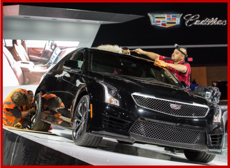 Brandon Glab (left) and Luis Pivaral detail a Cadillac ATS-V Wednesday, February 11, 2015 in preparation for Media Preview Days at the Chicago Auto Show starting Thursday at McCormick Place in Chicago, Illinois. The show opens to the public on Saturday.