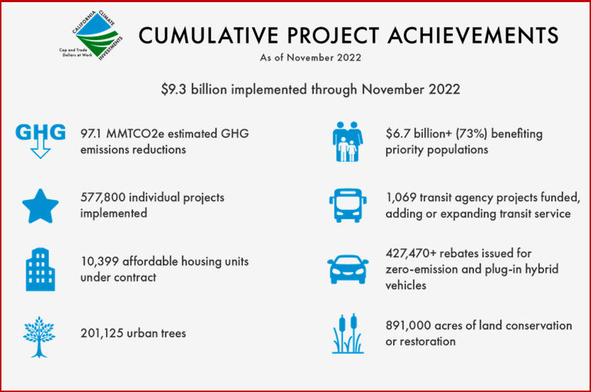 “Across California, 75 California Climate Investments programs administered by 23 state agencies are continuing to direct billions of dollars into the state’s transition to a low-carbon, more equitable future. During 2022, California Climate Investments programs implemented nearly $1.3 billion, in addition to $1.3 billion in expenditures by the High-Speed Rail Project, bringing the cumulative total to $9.3 billion. These dollars are delivering major economic, environmental, and public health benefits for Californians, including meaningful benefits to the most disadvantaged communities and low-income communities and households,” said CCI.