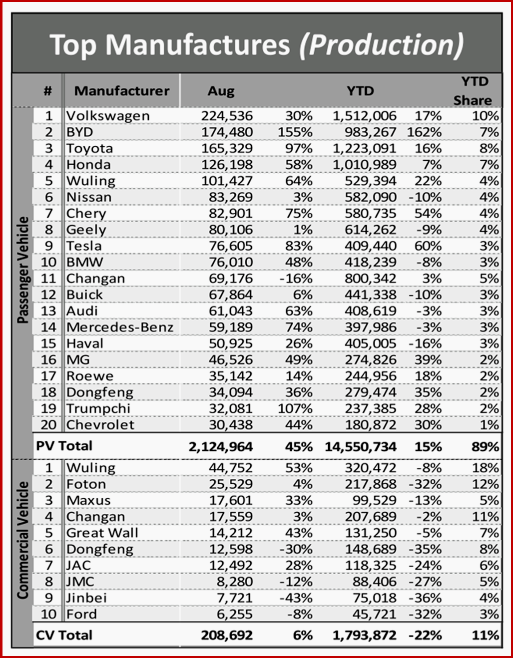 China Light Vehicle Manufacturers Aug 22 – courtesy of and copyright LMC Automotive