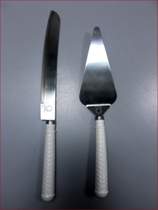 Both the knife and cake server have a white, textured ceramic handle. “Martha Stewart Collection” is embossed on the metal where the blades meet the handles. UPC 608356963330 and Product ID PRCDCKSRVR are printed on the product packaging. Sold at Macy’s stores nationwide and online, and at Military Exchanges between January 2014 and July 2017 for about $25 at Macy’s and $15 at Military Exchanges.