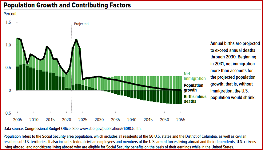 *“The Congressional Budget Office periodically updates its demographic outlook to reflect recent developments and changes in laws and policies. The agency last published its demographic projections in January 2025. Since then, CBO has incorporated new data and reduced its estimates of net immigration over the 2025–2033 period and fertility over the 2025–2055 period. Administrative actions taken since January 20, 2025, are the largest factor decreasing CBO’s projections of the number of immigrants in the country. The 2025 reconciliation act (Public Law 119-21) also decreases that number.