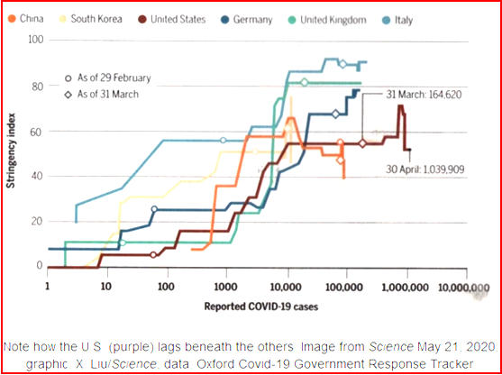 Stringency of U.S. Response Lags – Courtesy Science – data Oxford COVID-19 Government Response Tracker