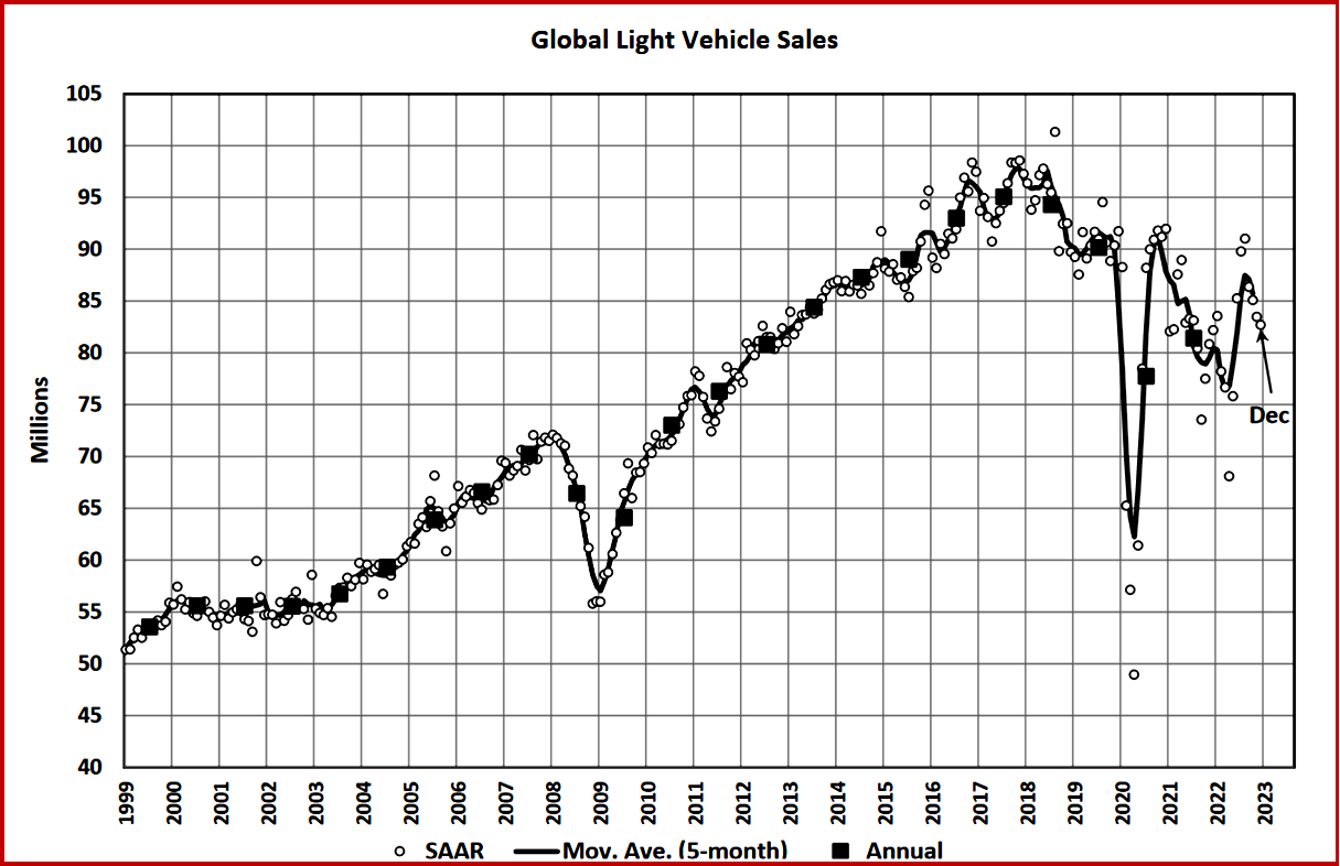 • The East European selling rate remained at 3.0 million units/year for December, despite raw monthly registrations increasing well versus November. The ongoing conflict in Ukraine has continued to suppress sales in this region with the annual total down 27% YoY, led chiefly by Russian sales falling almost 60% YoY.