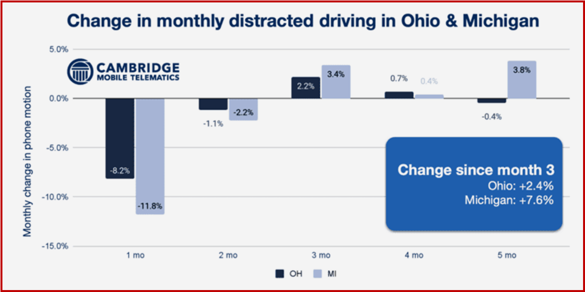 • Ohio has run this playbook well. As a result, the law has high awareness levels among Ohio drivers. And, as we’ve argued, awareness of hands-free laws leads to lower levels of distracted driving” said CMT.