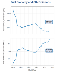 - For MY 2021, vehicle fuel economy remained at an all-time high of 25.4 miles per gallon (mpg), and new vehicle real-world carbon dioxide (CO2) emissions decreased to a record low of 347 grams per mile (g/mi).