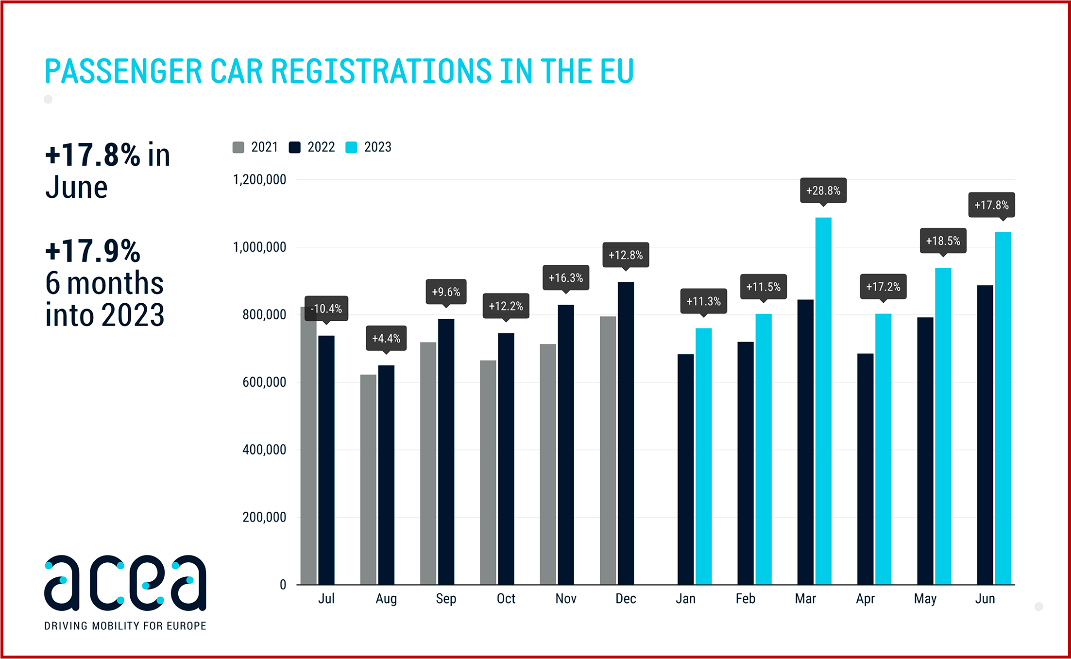 In June, new registrations of battery-electric cars in the EU increased by a significant 66.2%, reaching 158,252 units. This resulted in a market share of 15.1% (up from 10.7% in June 2022) and positioned battery-electric cars as the third most popular choice among new car buyers, overtaking diesel for the first time. Most EU markets recorded impressive double- and triple-digit percentage gains, including the largest, such as the Netherlands (+90.1%), Germany (+64.4%), and France (+52.0%). This contributed to a year-to-date growth of 53.8%, with 703,586 units sold between January and June.