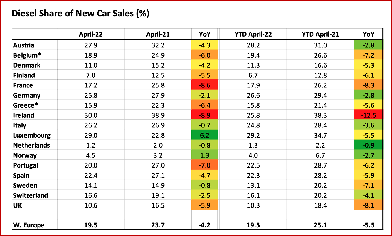 “With just two minor markets missing from April’s data at the time of writing, it looks like diesel share of new car sales (including hybrids) came in at 19.5% in April, while the YoY decline at just 4.2% was the smallest for a year, although the value of year-on-year comparisons is questionable in these times of disrupted vehicle manufacturing,” said LMC.
