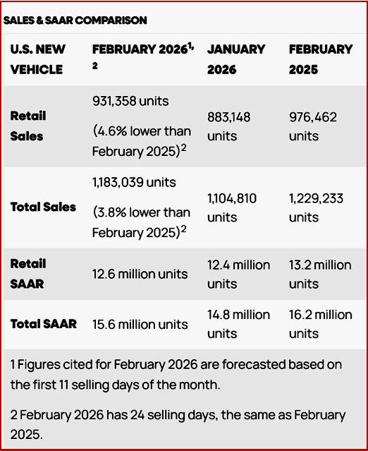 Total new-vehicle sales for February 2026, including retail and non-retail transactions, are forecast to reach to reach 1,183,000, a 3.8% decrease year-over-year, according to a joint analysis from J.D. Power* and GlobalData** as the Trump Slump continues. February 2026 has 24 selling days, equal to February 2025. The industry trend of affordability continues to grow.