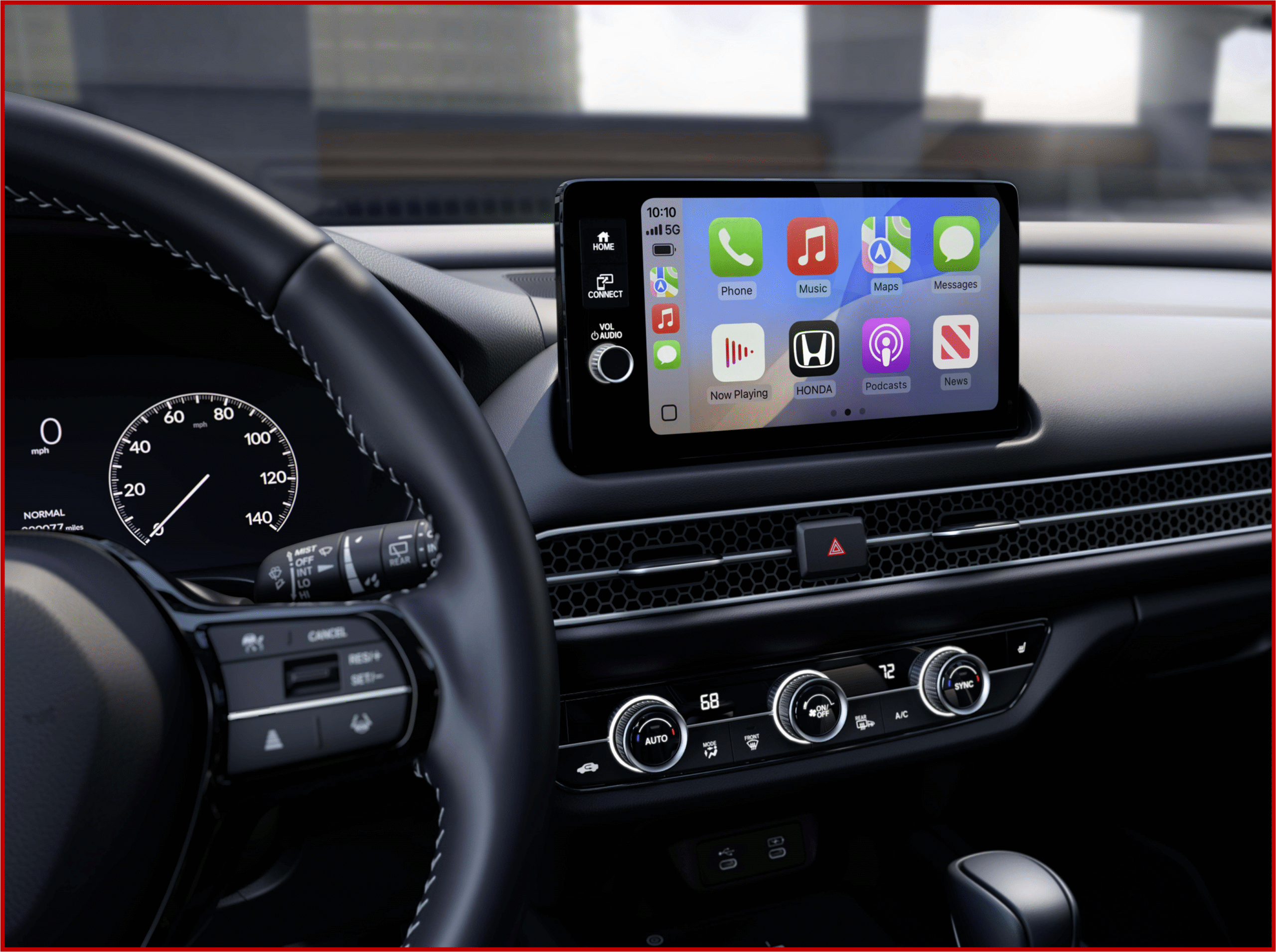 • Inside, HR-V LX and Sport gain a larger and easy-to-use 9-inch color touchscreen (+2-inches) with a faster processor for claimed lag-free performance, wireless Apple CarPlay and Android Auto™ compatibility, and a wireless phone charger – all standard. USB-C ports are placed “throughout the cabin.”