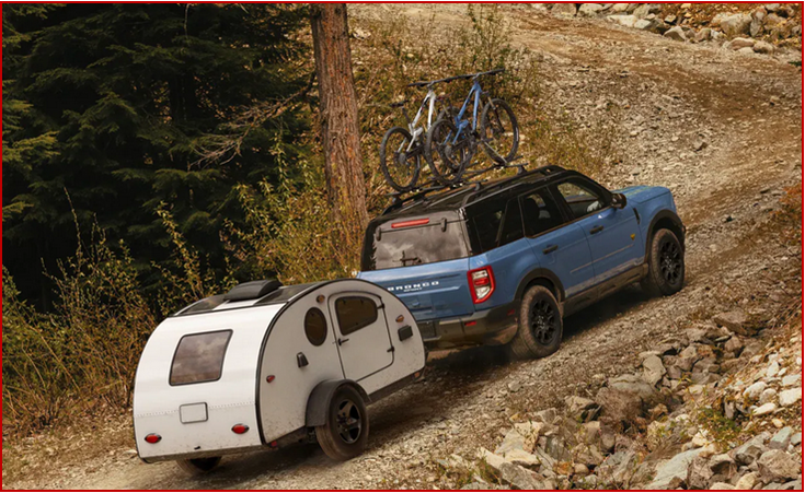 TK 2025 Bronco towing camper with two bikes on Bronco roof