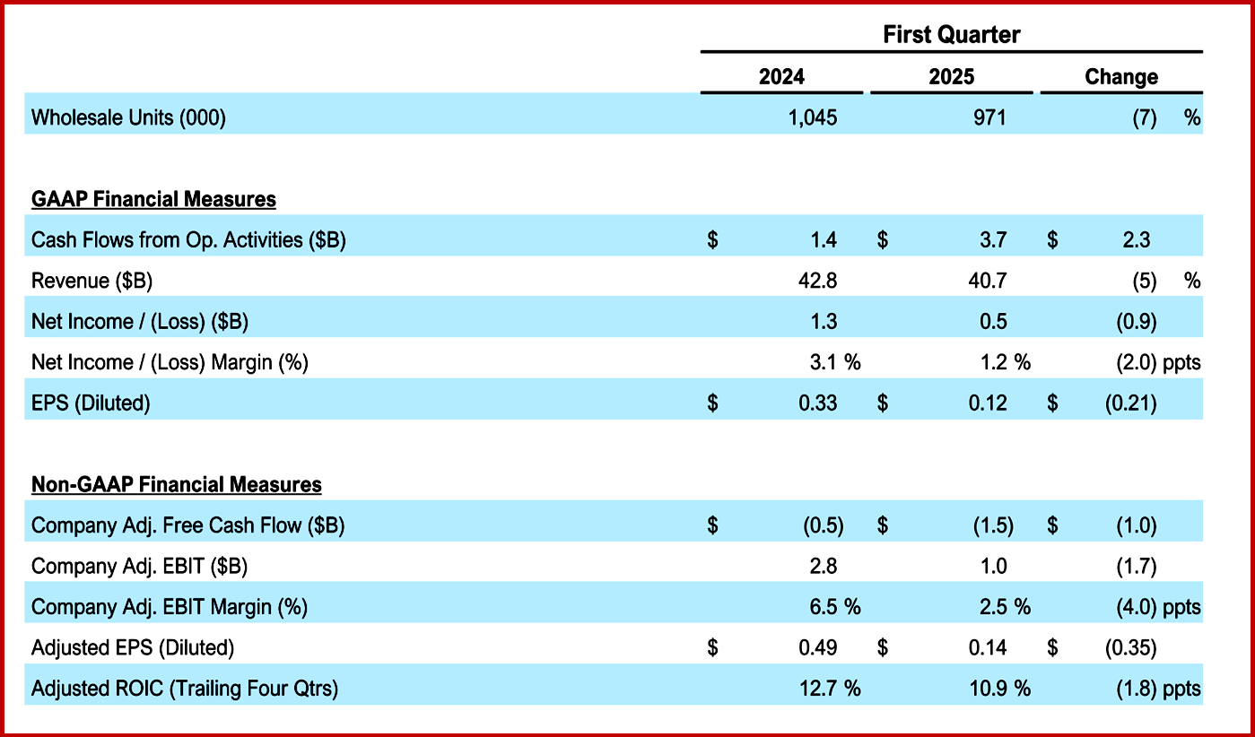 “Ford’s underlying business is strong – tracking within the previous adjusted EBIT guidance range of $7 billion to $8.5 billion, excluding new tariff-related impacts. Based on what the company knows now, and its expectation of how certain details and changes will be resolved related to tariffs, the company estimates a net adverse adjusted EBIT impact of about $1.5 billion for full-year 2025. Given material near-term risks, especially the potential for industrywide supply chain disruption impacting production, the potential for future or increased tariffs in the U.S., changes in the implementation of tariffs including tariff offsets, retaliatory tariffs and other restrictions by other governments and the potential related market impacts, and finally policy uncertainties associated with tax and emissions policy, the company is suspending guidance. These are substantial industry risks, which could have significant impacts on financial results, and that make updating full year guidance challenging right now given the potential range of outcomes. The company will provide an update during the Q2 earnings call. Ford’s annual meeting will take place online at 8:30 a.m. ET on Thursday, May 8,” Ford said.