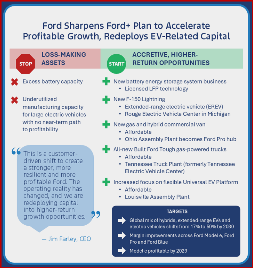 “This is a customer-driven shift to create a stronger, more resilient and more profitable Ford,” said (claimed?) Ford president and CEO Jim Farley. “The operating reality has changed, and we are redeploying capital into higher-return growth opportunities: Ford Pro, our market-leading trucks and vans, hybrids and high-margin opportunities like our new battery energy storage business.”