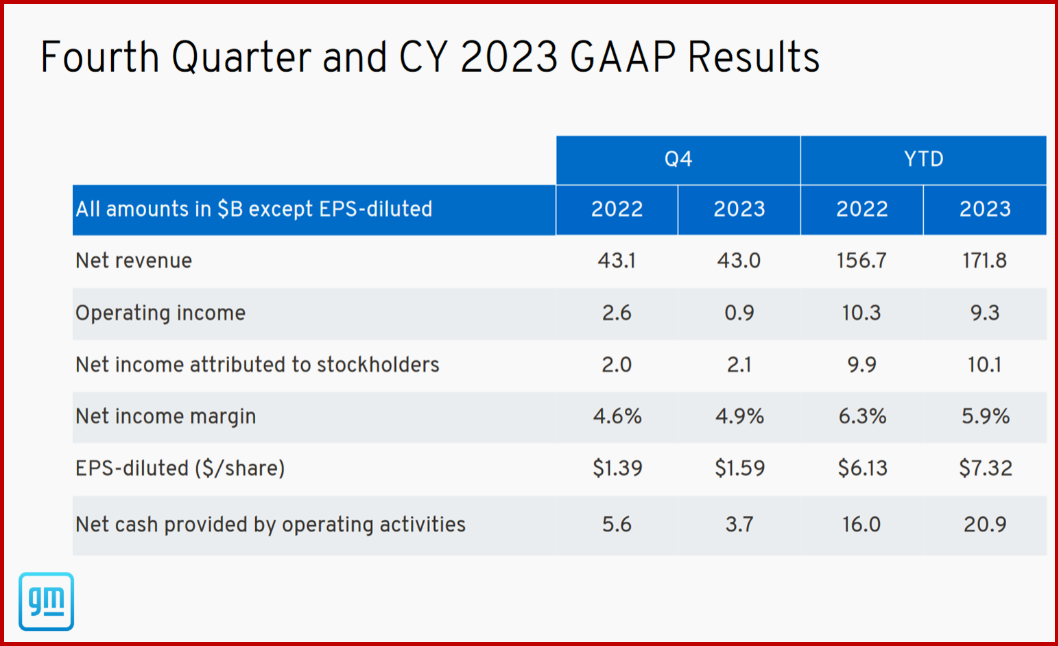 General Motors (NYSE: GM) today reported fourth-quarter 2023 revenue of $43.0 billion with net income attributable to stockholders of $2.1 billion and EBIT-adjusted of $1.8 billion. GM also reported full-year 2023 revenue of $171.8 billion, net income attributable to stockholders of $10.1 billion and EBIT-adjusted of $12.4 billion. This is $7.32 of earnings per share, easily topping its final 2023 guidance.