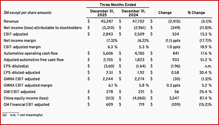 Q4 net income was reduced by more than $7.2 billion in special charges largely by a realignment of electric vehicle capacity and investments to adjust to expected declines in consumer demand for EVs, and in response to U.S. Government policy changes including the termination of consumer incentives and the reduction in the stringency of emissions regulations.