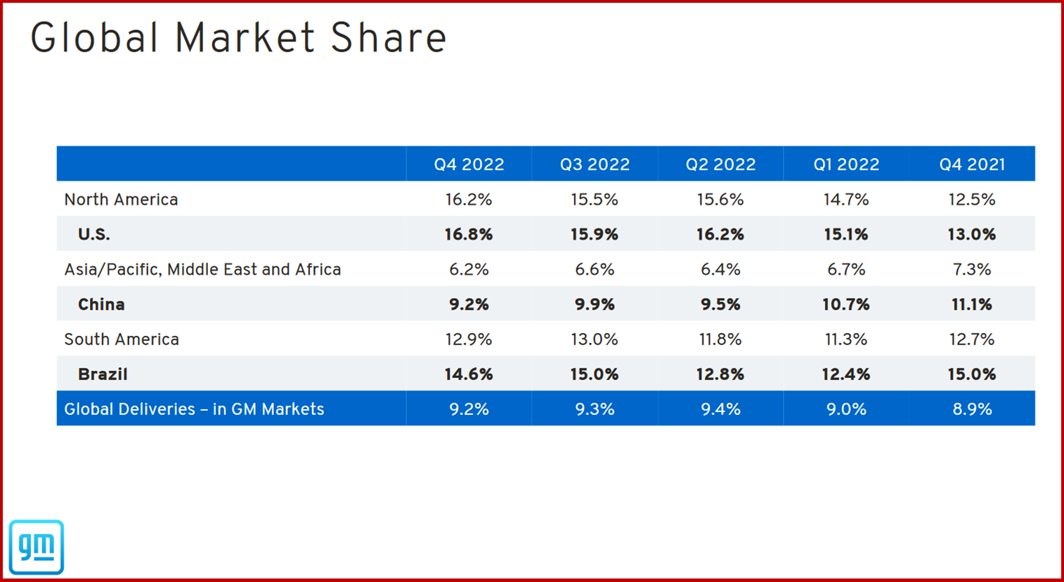 GM led the US industry in total sales and delivered the largest year-over-year increase in market share of any OEM, because of strong consumer demand for its products and improved supply chain deliveries. GM was number one in total sales; sales of full-size pickup trucks, sales of full-size, large luxury SUVs; and number one in the sales luxury sports cars. GM also said expects its core automotive operations to perform at a “consistently strong level in 2023, with full-year net income attributable to stockholders of $8.7 billion-$10.1 billion, EBIT-adjusted of $10.5 billion-$12.5 billion, and EPS-diluted and EPS-diluted-adjusted of $6.00-$7.00.” GM also forecast strong cash flows from automotive operations for the calendar year, including net automotive cash provided by operating activities of $16.0 billion-$20.0 billion; and adjusted automotive free cash flow of $5.0 billion-$7.0 billion. Moreover, GM forecasts a doubling in company revenue to $275-$315 billion by 2030.