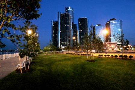 The RiverWalk and Wintergarden entrance to the GM Renaissance Center, along the Detroit River in Detroit, Michigan, USA, June 23, 2005. (General Motors/John F. Martin)