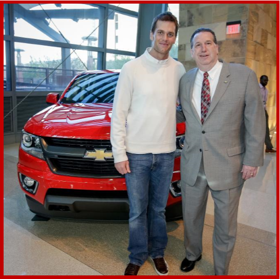 New England Patriots Quarterback Tom Brady (left) receives a 2015 Chevrolet Colorado pickup after Brady was named Super Bowl XLIX MVP in Glendale, Arizona. Brady led his team to a 28-24 victory over the Seattle Seahawks last Sunday.