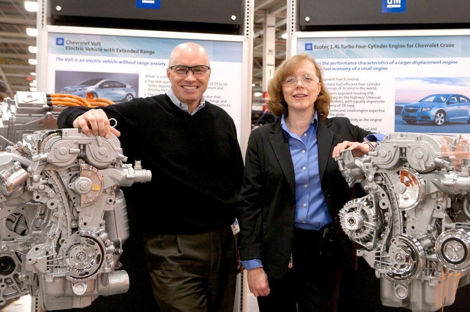 Bay City Powertrain Plant Manager Joe Mazzeo (left) and Flint Powertrain Plant Manager Kathleen Dilworth pose with 1.4L engines their plants will be producing after General Motors announced a $163.2-million investment at its operations in Flint and Bay City, Michigan, and Defiance, Ohio Wednesday, November 24, 2010 in Flint, Michigan. The investment will protect 184 jobs at the three sites and support engine production for the Chevrolet Volt, Chevrolet Cruze and a new Chevrolet small car to be built in the United States. GM has invested more than $3.3 billion and created or retained more than 8,000 jobs in 21 U.S. plants since emerging from bankruptcy in July 2009. (Photo by John F. Martin for General Motors)