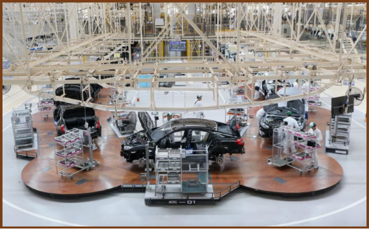 Japanese innovation in production technology continues since Honda introduced a so-called ARC Line to Honda’s new Prachinburi Plant in Thailand that started in March 2016. In ARC Line production, four workers get on board an ARC Unit, a conveyor that carries one vehicle body and a complete set of parts to be installed to the vehicle body. The workers assemble the vehicle while moving along the production line together with the vehicle.