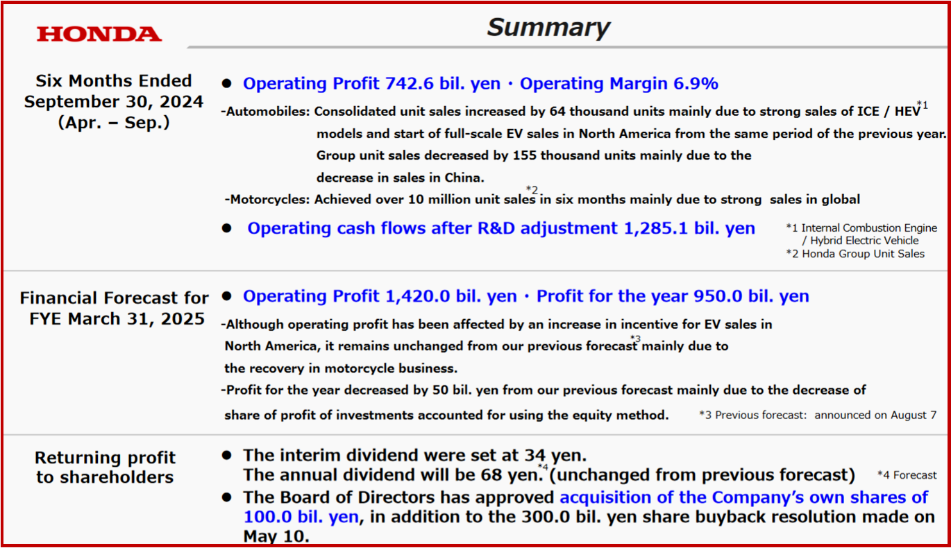Honda Motor Company (NYS: HMC) today posted consolidated financial results for the 2025 fiscal first half for the year ending 30 September 2024. Operating Profit was ¥742.6 billion with an Operating Margin 6.9%. The operating cash flow after R&D adjustment remained at the same level as the same period last year at ¥1 trillion 285.1 billion. The Board of Directors has approved acquisition of the Company’s own shares of ¥100.0B, in addition to the ¥300B share buyback resolution made on May 10.