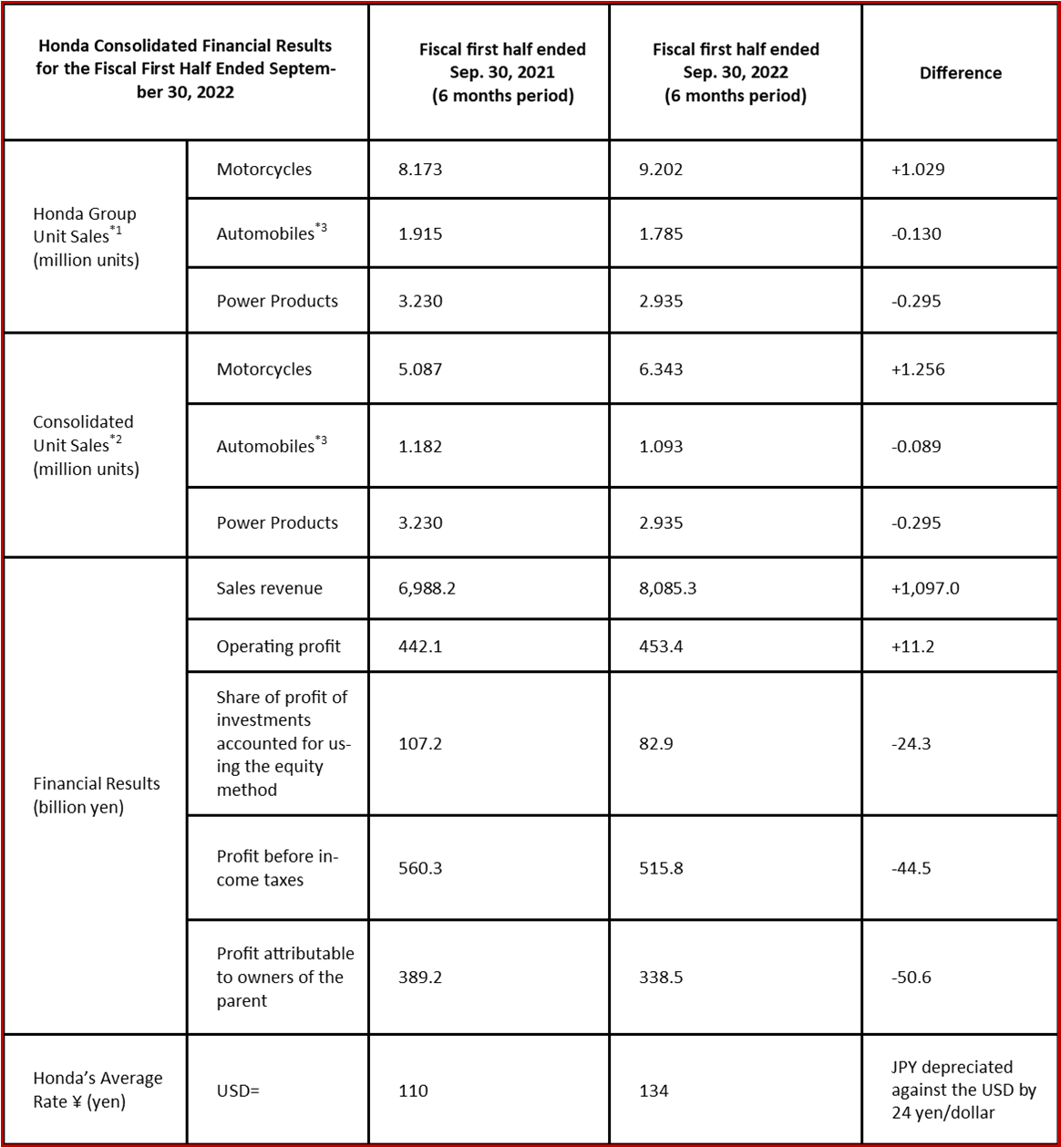 “Despite the impact of a decrease in automobile unit sales and the forecasted continuation of upward pressure on costs, the previously announced forecast for consolidated operating profit for the current fiscal year ending 31 March 2023 (FY23) was revised upward by ¥40B to ¥870B, reflecting an increase in motorcycle unit sales in some countries such as India and Vietnam and recent currency effects.” The previously announced forecast for profit for the fiscal year attributable to owners of the parent was revised upward by ¥15B to ¥725B,” Honda said.