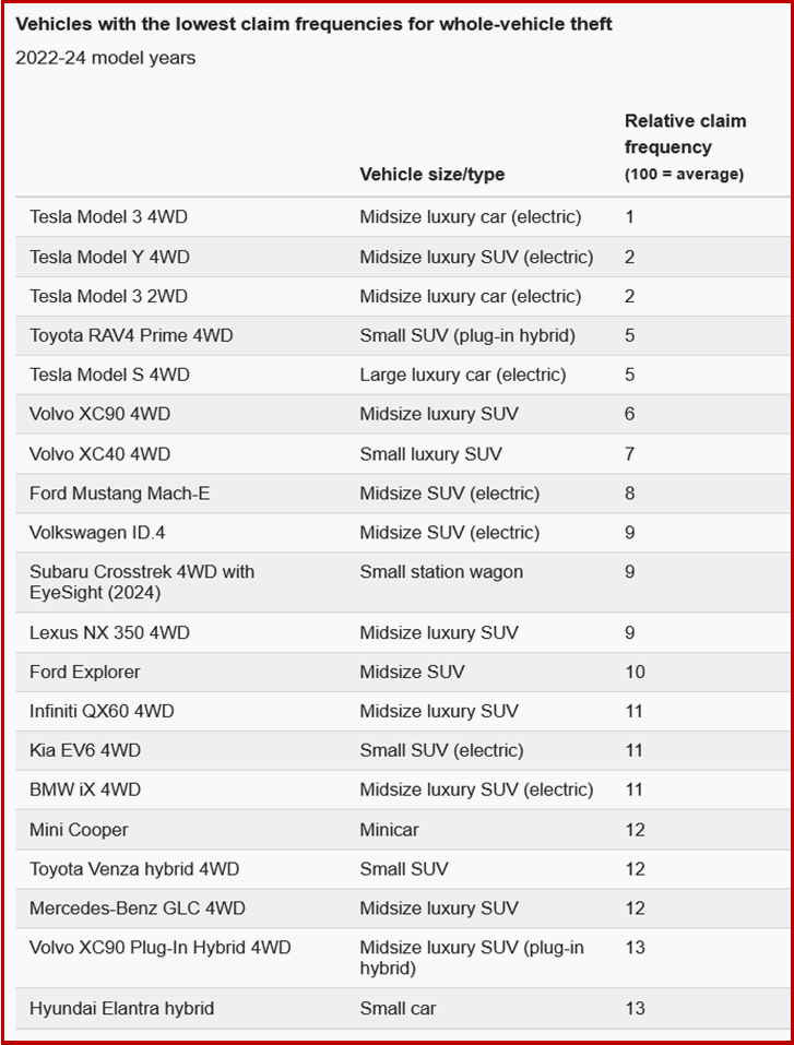 The 20 least-stolen vehicles include eight electric vehicles and two plug-in hybrids, all of which have whole-vehicle theft claim frequencies that are more than 85% lower than the all-vehicle average. As previous HLDI studies have found, electric vehicles are likely to be garaged or parked near buildings to facilitate charging, making them less attractive to thieves.