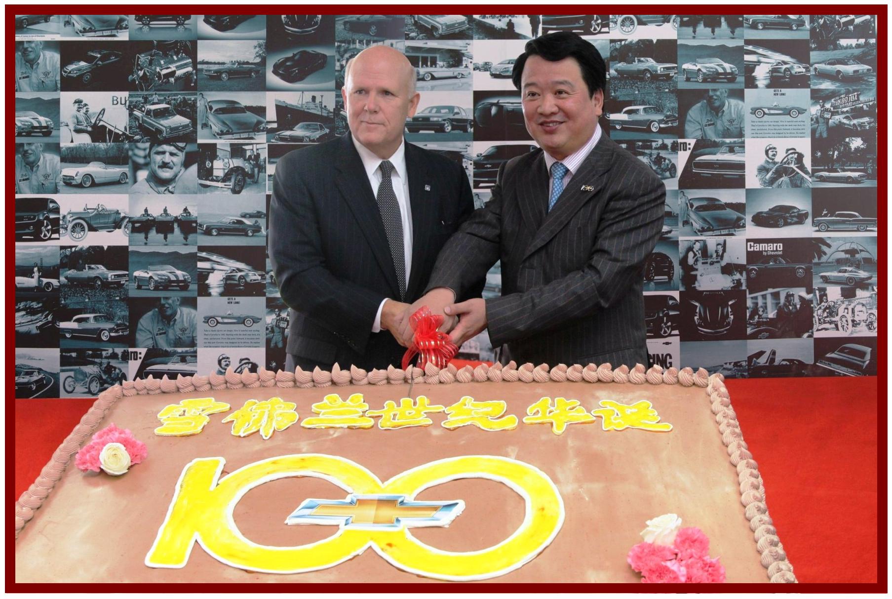 GM Chairman and CEO Dan Akerson (left) and Shanghai GM General Manager Ye Yongming celebrate Chevrolet’s Centennial.