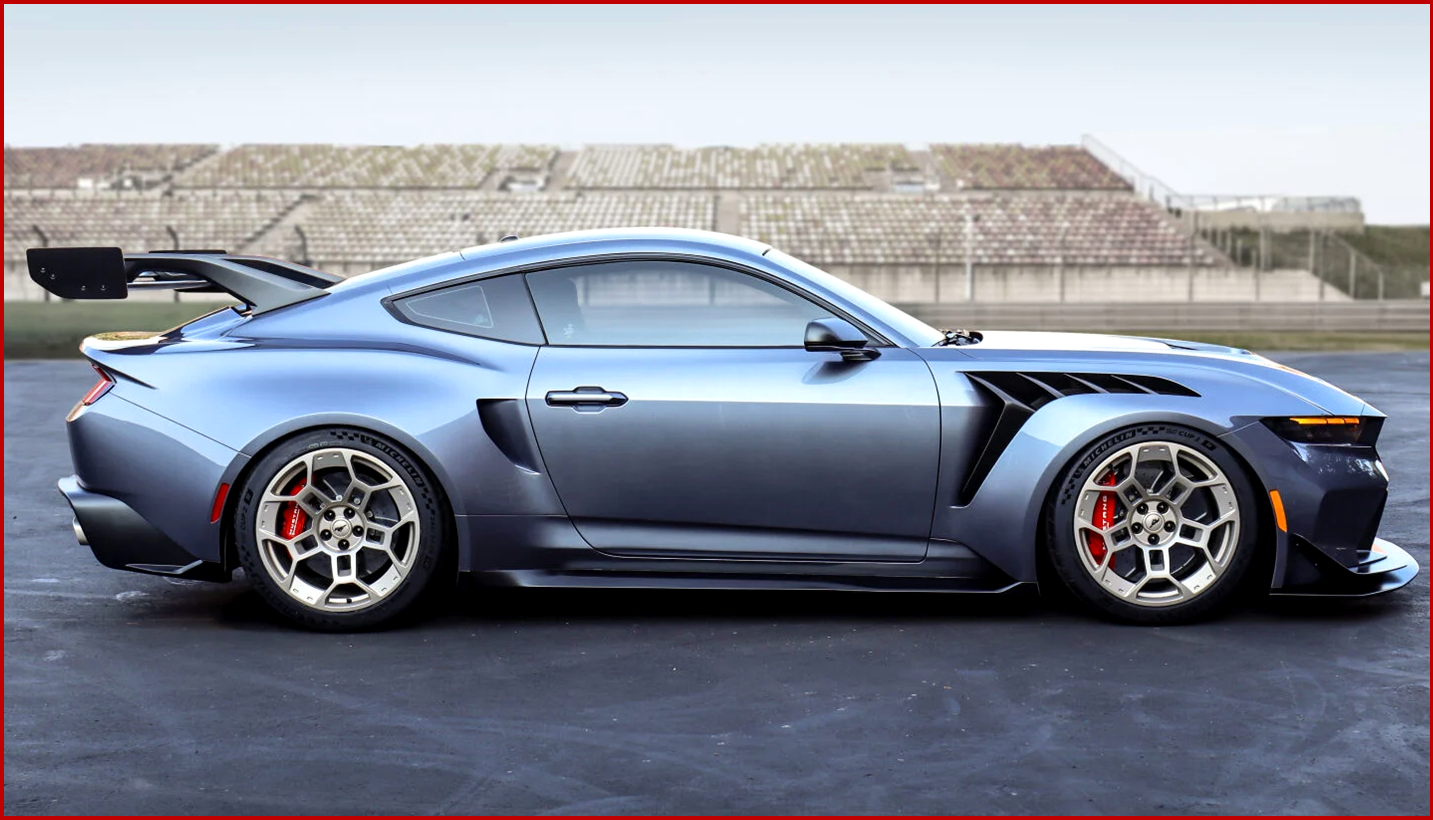 Performance aspirations are more than 800 horsepower and a sub-7-minute Nürburgring time.* Mustang GTD will be available in late 2024, early 2025. GTD has a supercharged 5.2-liter V8 with dual air inlets and the first dry-sump engine oil system fitted to a roadgoing Mustang to help keep the engine lubricated during sustained and cornering. The engine’s ~7500 rpm redline generates noise through the optional titanium active valve exhaust system. It’s the highest horsepower street-legal Mustang ever developed by Ford.