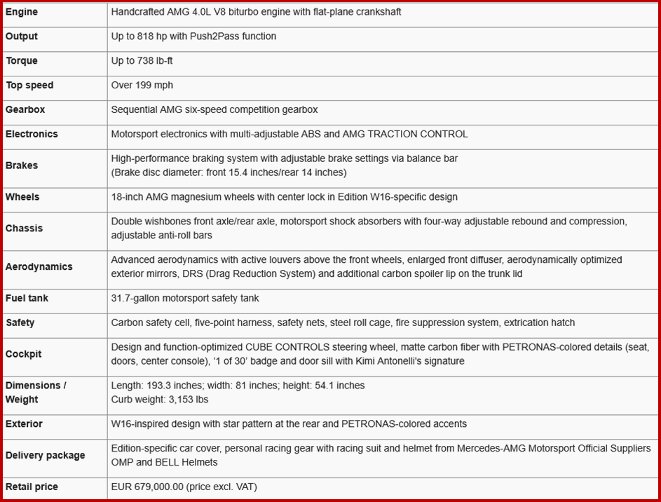 “The Mercedes-AMG GT2 Edition W16 reaches its peak performance when the Push2Pass function is activated, which is another new feature. When the driver presses the corresponding button on the multifunction steering wheel, the system temporarily increases the boost pressure. This provides an additional 98 hp and 148 lb.-ft. of torque. The maximum torque thus rises to 738 lb.-ft. and the maximum output of 818 hp is achieved. The special edition model boasts an impressive power-to-weight ratio of approximately 3.85 lb./hp. Thanks to its consistent lightweight construction, the GT2 Edition W16 has a weight of just 3153 lbs. The newly designed magnesium wheels, which feature color accents that create a visual link to the Formula 1® car, also contribute to weight optimization,” Mercedes said.