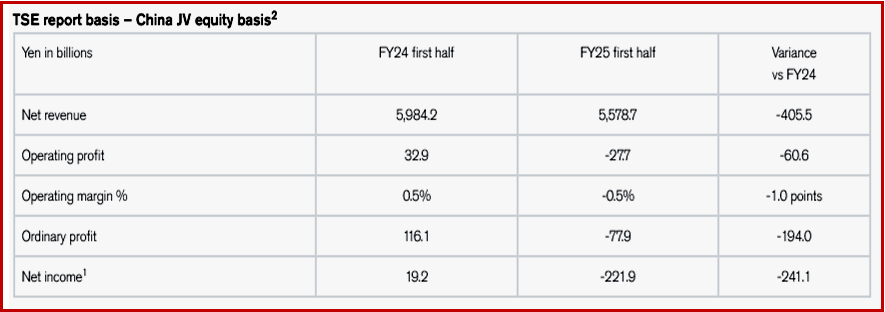 Nissan First Half Financial Results Japanese FY 2025 – TSE report basis – China JV equity basis – Courtesy of and copyright Nissan Nov. 2025 all rights reserved