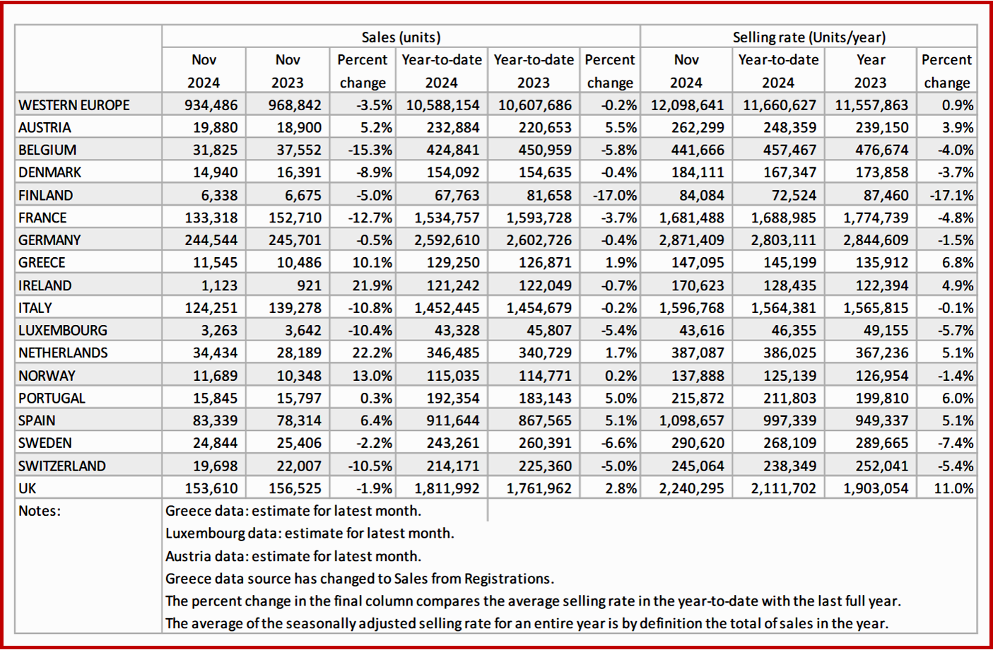 The UK PV market fell 1.9% YoY to 154,000 units in November. The selling rate improved 5.8% MoM to 2.24 million units/year. YTD sales stand at 1.81 million units, a near 3% improvement from the same period in 2023. However, demand from private buyers continued to decline, down 3.3% YoY.