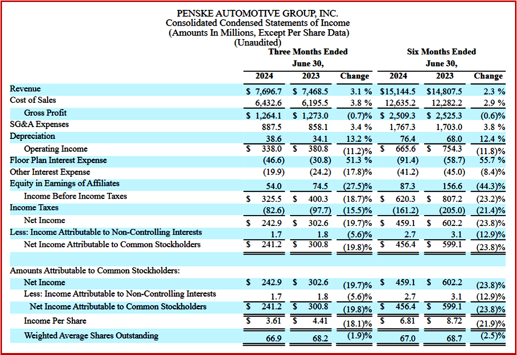Penske Automotive Group (NYSE: PAG) today posted $7.7 Billion in revenue during Q2 2024, a quarterly record. Q2 included a 10% increase in quarterly retail automotive service and parts revenue to $753 million, which is also a quarterly record. However, net income attributable to common stockholders was $241.2 million compared to $300.8 million in the prior year period, and related earnings per share was $3.61 compared to $4.41 for the same period in 2023. Foreign currency exchange negatively impacted revenue by $0.8 million, net income attributable to common stockholders by $0.4 million, but had no negative effect on earnings per share. For the six months ended 30 June 2024, revenue increased 2% to $15.1 billion. Net income attributable to common stockholders was $456.4 million compared to $599.1 million in the prior year period, and related earnings per share was $6.81 compared to $8.72 for the same period in 2023. Foreign currency exchange positively impacted revenue by $97.3 million, net income attributable to common stockholders by $1.0 million, and earnings per share by $0.01.