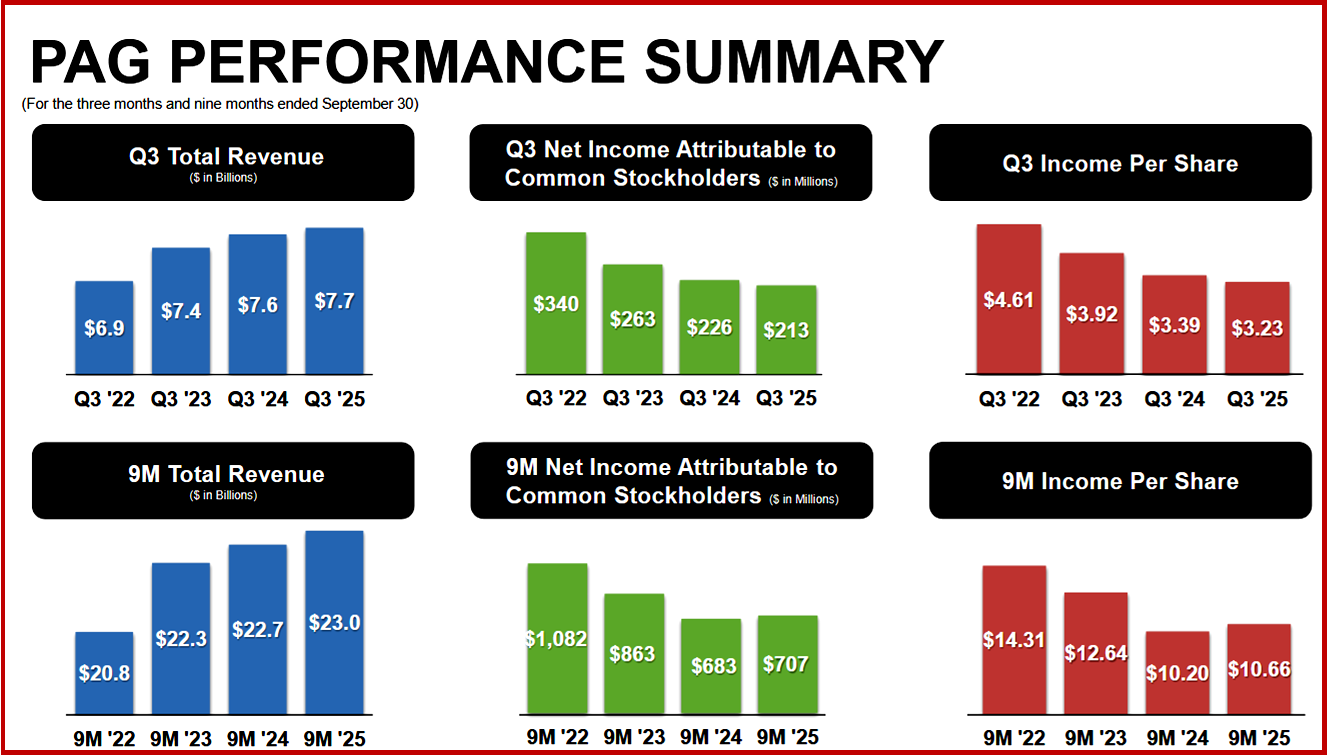 “Overall, I am pleased with our performance during the third quarter. We grew same-store retail automotive new units delivered by 4%, reduced new vehicle inventory days supply by 6 days from the end of June and increased retail automotive service and parts revenue to a quarterly record of $818.3 million, including same-store service and parts revenue growth of 5%,” said Chair Roger Penske.