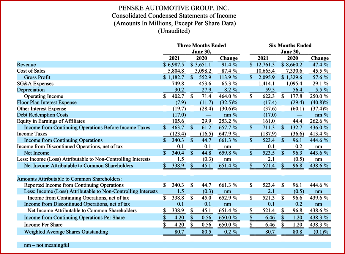 Penske Automotive Group (NYSE:PAG), today announced second quarter and six months 2021 results. For the three months ended June 30, 2021, the company reported a 652.9% increase in income from continuing operations attributable to common shareholders to $338.8 million and a 650.0% increase in related earnings per share to $4.20. This compares to income from continuing operations attributable to common shareholders of $45.0 million, or $0.56 per share, in the prior year.