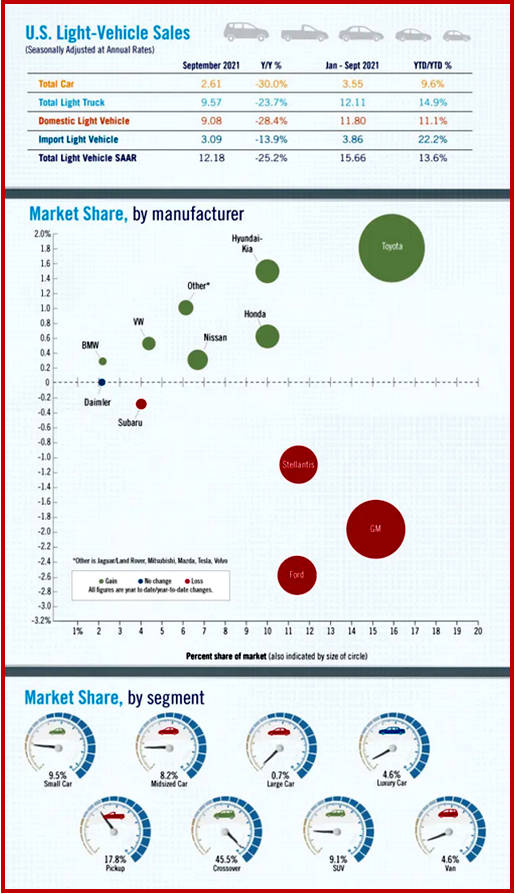 September had the same 25 selling days from a year ago, and the typically strong selling Labor Day weekend failed to help volume. Retail sales of 866,000 units were the decline in the month, while fleet sales are estimated to have fallen by 15% YoY