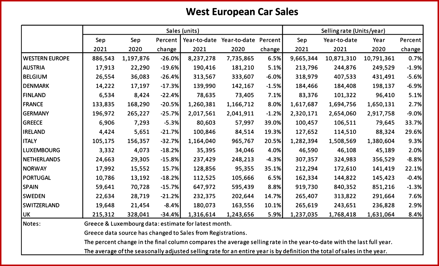 West European Passenger Car Sales Sept 2021 – Courtesy LMC Automotive